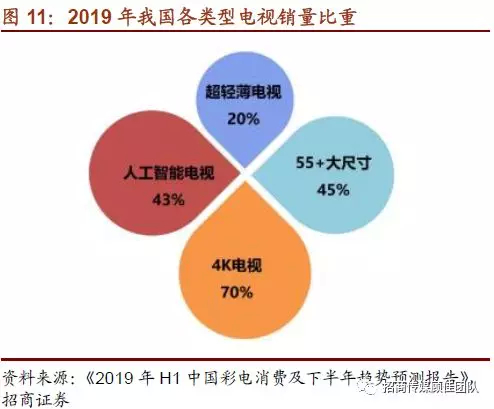 从销售量上看,4K电视已经是市场上的主要电视品种。2018年中国4K电视占销售量的比例达69%,49英寸以上的大屏电视完成了4K的普及,而小尺寸电视中4K产品占比略低。2019年H1国内彩电消费2200万台,4K超高清电视占比达到70%;预计全年彩电销量4500万台,4K电视占比将超过80%。预计2019年底,4K超高清电视消费占比将达80%,有望完全取代非超高清的电视。
