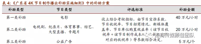 我国政府还对超高清视频产业予以财政支持和补贴,补贴方向集中在超高清节目制作和超高清电视终端上。例如《进一步优化供给推动消费平稳增长促进形成强大国内市场的实施方案(2019年)》中明确提出有条件地区可对超高清电视、机顶盒、虚拟现实/增强现实设备等超高清终端产品推广应用予以补贴;中央和各省市出台的《超高清视频产业发展行动计划(2019-2022年)》中也提出以成立专项基金、税收优惠和补贴超高清视频设备采购等补助方式来促进超高清产业的发展。超高清频道节目制作方面,以《广东省4K节目制作播出补助实施细则》为例:对符合4K标准的电影、电视剧、综艺节目、电视广告等节目类型,根据节目时长予以补贴,补贴金额在10万/小时-40万元/小时。
