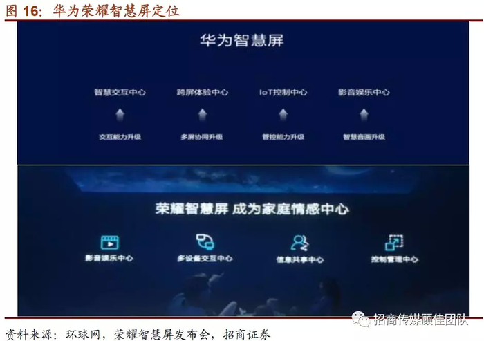 另一方面,大屏电视有望在5G物联网时代成为智慧家庭的流量入口,家庭“C位”地位回归,潜在硬件需求提供超高清内容市场想象力。随着智能家电生态圈的逐步形成,在家庭各类硬件迭代的场景下,智能家电生态提出了更多交互的需求,凸显了家庭控制中枢的不可或缺性。在“客厅文化“的影响下,电视作为家庭唯一的大屏,无疑是智慧家电生态最好的入口。智能家居场景里,消费智能设备和家庭智能家居设备都提出了越来越多的交互需求,需要有一个中心入口来整合控制。华为从智能电视屏这一家庭的公用大屏切入智能家居生态。华为定义智慧屏将成为智能家居生态系统的交互中枢,承担着家庭影音娱乐中心、多设备交互中心、信息共享中心、控制管理中心的定位,不仅为用户提供视听服务、信息共享服务,还能够实现与手机、与平板、甚至与智能家居设备交互的功能,并能够通过智慧屏实现所有智能家居设备的统一控制。这一对于家庭大屏的崭新定位放大了家庭大屏硬件的重要性,电视大屏从单一的视听服务入口变成智慧家庭生态的公用大屏,随着家庭各类硬件设备的迭代和智能化,将刺激对于大屏的需求,潜在硬件需求为超高清内容提供增量市场想象力。