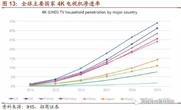 2)超高清硬件终端渗透率逐步上升形成有力硬件基础,同时消费者日益偏好大屏终端,屏幕尺寸的增长对内容画质提出了更高的要求。超高清内容+终端对于最终画面呈现缺一不可,1080p画质的影片内容在4K终端终端上播放,呈现效果都会打折扣。根据IHS预计,2019年美国将仍然保持全球最高的35%的超高清电视机渗透率,紧随其后的是英国31%、欧洲25%和中国24%。同时,大尺寸电视成为市场主流,2018年彩电市场平均尺寸接近50英寸,预计2019年65英寸电视产品渗透率接近12%,成为55英寸后的第二大尺寸。超高清大尺寸终端的渗透率,将激发超高清内容的生产供应。