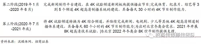 广电系统以央视为例,据流媒体网,中央电视台的4K超高清电视发展战略是,基于4K超高清电视“采、编、播、存、传”的制播技术体系打造并通过4K超高清试验频道的应用实践,将4K经验推广到全台各频道。4K超高清电视的整体建设目标是2018年-2021年,完成全台4K超高清频道技术系统建设,具备每天约60小时的4K节目制作能力,分为三个阶段目标。2018年10月1日,中央广播电视总台4K超高清频道(频道呼号:CCTV-4K,简称:央视超高清频道开播,这是国内首个上星超高清电视频道,截至2019年7月,CCTV-4K超高清频道触达观众达2.48亿,一线城市4K频道整体触达率为34.1%;2019年中央广播电视总台《春节联欢晚会》首次使用4K超高清直播。此外,地方广电系统如广东、北京、江苏、湖南、浙江、上海等也有4K节目或频道布局。