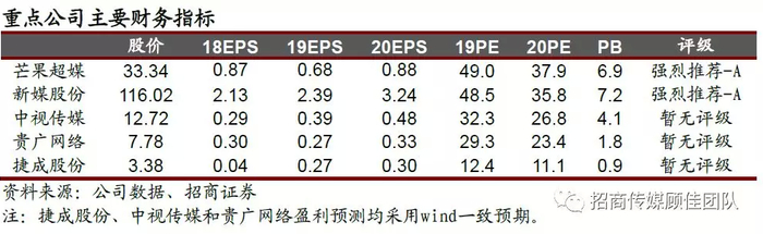 重点关注标的:随着5G商用的逐步落地,未来大屏新媒体发展前景广阔,建议关注:芒果超媒、新媒股份、爱奇艺(IQ.US)、中视传媒、捷成股份、贵广网络等。