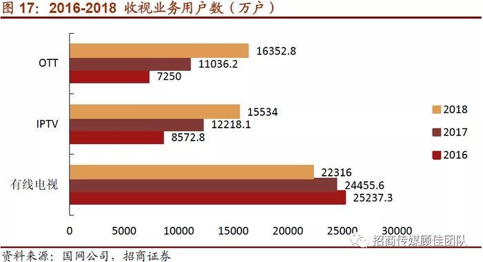 过去两年来,广电有线电视用户数连续两年下滑,提高节目内容资源和质量迫在眉睫。传统有线电视业务受到IPTV和OTT等互联网电视的冲击,根据国网公司统计,有线电视用户数连续两年下滑,2018年总用户数2.23亿户,同比下降8.7%;对比之下,OTT和IPTV在2018年用户分别达到1.64亿户和1.55亿户,同比增速分别为48.2%和27.1%