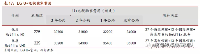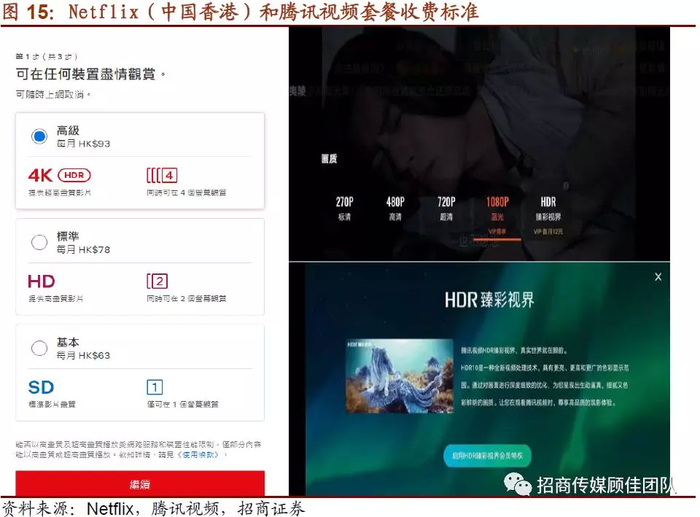 我们认为,对于内容方而言,一方面发展制作超高清内容是大势所趋,同时随着超高清电视渗透率的提升以及5G商用的逐步落地,体验和适应了超高清视频的用户会对画质有更高的要求,非超高清视频内容会逐渐不被接受。另一方面,超高清视频打破了视频内容服务价格的天花板,带来内容价值上扬的空间,视频内容的价格天花板将再度打开,对于很多流媒体视频网站而言有望提升ARPU值。目前已经出现了对于超高清画质内容采取更高定价的情况,美国主要流媒体内容商均开始推出4K内容。以Netflix为例,Netflix在中国香港地区推出3档包月服务价格,包月价格和画质及屏幕数量相挂钩:标清&1个屏幕入口每月63港币,高清&2个屏幕入口每月78港币,4K画质&4个屏幕入口每月93港币。同时在韩国,Netflix联手韩国电信运营商推出超高清电视服务,一年合约价格35400韩元,共享受225个频道,包括27个高级频道,13个国际频道及具有超高清画质质量的Netflix视频内容,该合约较高清一年合约高出2500韩元。此外,超高清内容也将成为内容服务的竞争要素,随着抢先入局超高清的服务商逐步扩大超高清视频内容,其他公司也将逐步入局,如美国Netflix已提供4K内容服务,迪士尼流媒体平台Disney+也支持4K内容,国内方面,腾讯视频在部分内容上提供了HDR功能,作为腾讯视频会员的权益。