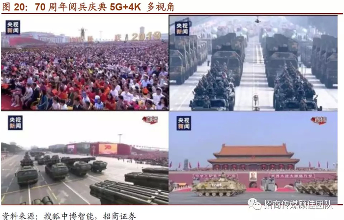 3)供给能力:目前广电系统正推进超高清装备升级,已完成5G+4K直播多项实践,超高清内容供应能力逐步提升。以央视国庆70周年阅兵庆典为例,央视自2018年起启动4K HDR直播国庆盛典的技术准备工作,新投产4K设备总投资超过10亿元,包括4K转播车、4K移动拍摄车、4K演播室等硬软件系统。国庆70周年阅兵庆典,央视采用了4K分辨率、50帧、BT2020、HDR、10bits、36Mbps的高码率进行全国的卫星直播,本次直播提供了多达1+7多视角全景式70小时不间断直播,视角涵盖全景天安门视角、观礼台视角、贴地视角、仰视镜头、群众观礼台视角、高空视角等,相比导播决定观众观看的内容,观众可以自由选择并切换观看视角。据央视索福瑞数据,70周年大会阅兵式群众游行特别报道,中央电视台综合频道全天收视率为6.84%,市场份额26.42%;央视8个频道占据前八,总收视率超过20%,总市场份额超过60%。伴随着内容供给体系的逐渐完善,超高清内容在广电领域的应用将走向常态化。