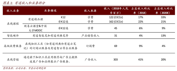 有道主要有四大收入来源:在线课程学费、智能硬件销售、知识工具和企业服务相关的订阅服务收入,以及知识工具产生的广告收入。