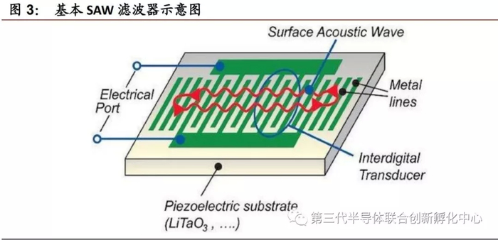 SAW是一种沿着固体表面传播的声波。一个基本的SAW滤波器由压电材料(piezoelectricsubstrate)和2个InterdigitalTransducers(IDT)组成。电信号通过IDT转为声波,声波通过IDT又转为电信号。这一过程主要是依赖压电材料,压电是指晶体在收到外部压力时会产生电压,相反地,晶体两面存在电压时,形状会发生微变。