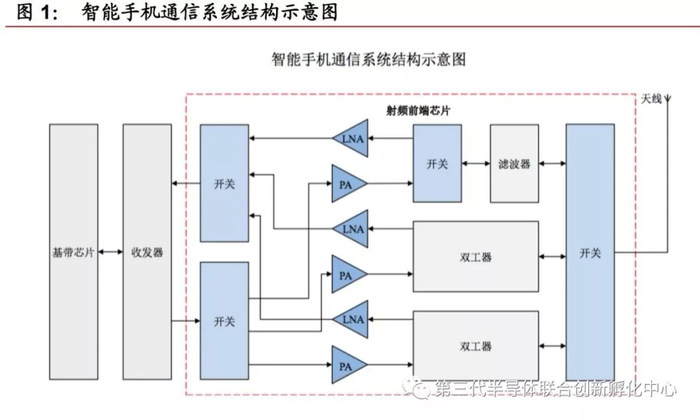 天线用于无线电波的收发;射频开关用于实现射频信号接收与发射的切换、不同频段间的切换;LNA用于实现接收通道的射频信号放大;PA用于实现发射通道的射频信号放大;滤波器用于保留特定频段内的信号,而将特定频段外的信号滤除;双工器用于将发射和接收信号的隔离,保证接收和发射在共用同一天线的情况下能正常工作。