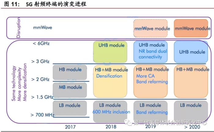 在5G建设上,方向大体呈现为基站建设—手机等终端设备—智能物联应用。当前全国已经开始如火如荼开展5G宏基站与微基站的建设,2019-2025年预计以5GNSA网络为主,2025年起以5GSA网络为主,建设过程循序渐进,发展周期较长。终端侧,5G初代手机也已在2019年陆续上市。截至2019年11月已发售5G手机9款,包括三星GalaxyNote10+5G、华为Mate20X5G、华为Mate30/30Pro5G、华为MateX5G、中兴天机Axon10Pro5G、vivoiQOOPro5G、vivoNEX35G、小米9Pro5G、OPPOReno5G。但目前5G手机均只使用Sub-6低频段,除华为Mate305G基带芯片支持NSA和SA双模式外,其余手机仅支持NSA模式。未来随着5G网络由低频段拓宽至毫米波段,由NSA过渡到SA,5G手机将迎来更大的换机空间。移动通讯技术的不断变革与配套射频前端芯片的性能的优化,将不断推动移动数据传输量和传输速度的提高,射频前端的重要性不言而喻。
