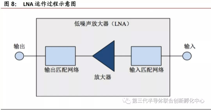 LNA的工作原理如下:输入的射频信号被输入匹配网络转化为电压,经过放大器对电压进行放大,同时在放大过程中最大程度降低自身噪声的引入,最后经过输出匹配网络转化为放大后功率信号输出。