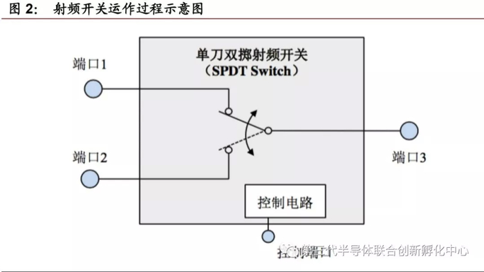 它的运作原理如下:当射频开关的控制端口加上不同电压时,射频开关各端口将呈现不同的连通性。以单刀双掷射频开关为例,当控制端口加上正电压时,连接端口1与端口3的电路导通,同时连接端口2与端口3的电路断开;当控制端口加上零电压时,连接端口1与端口3的电路断开,同时连接端口2与端口3的电路导通。通过控制电压,实现了不同电路的连通。