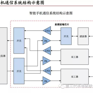 其接收通道:信号—天线—天线开关—滤波器/双工器—LNA—射频开关—射频收发—基带;