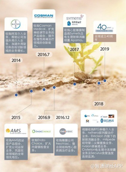 此外,2010-2018年期间公司进行了一系列收购:收购了拜耳介入业务,帮助公司加强外周介入业务,加速外周旋切和血栓切除领域业务的增长;收购AMS的泌尿产品组合,扩充公司泌尿业务,巩固在该领域的全球领先地位;收购瓣膜公司 NeoVasc,收购心脏瓣膜制造商Symetis及电生理射频消融球囊 Apama;2018年相继收购了BTG肿瘤介入业务、nxthera前列腺治疗业务、EMcision内镜下射频消融业务、milipede经导管二尖瓣臵换业务、Cryterion 电生理冷冻球囊业务等。