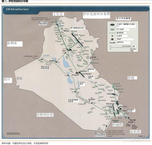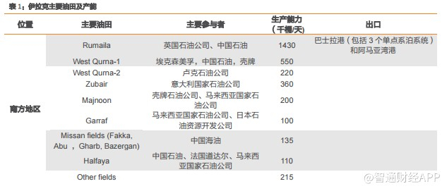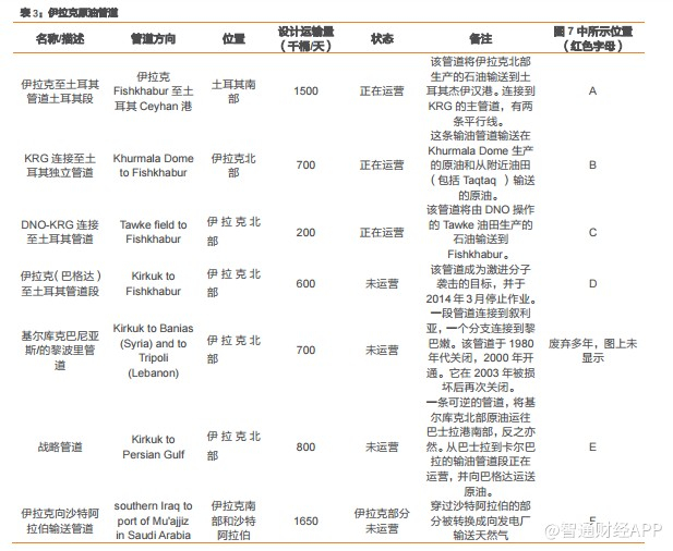 目前,伊拉克原油只有南北两条出口通道,管道运输原油出口在北边,受库尔德斯坦政府控制,主要有两条管道,管输能力90万桶/天。南边是伊拉克政府地区,也是伊拉克原油出口的主要地区,南边拥有大型港口Basra港,总出口能力达到450万桶/天。