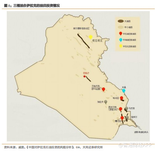 中石油参与投资了伊拉克四块油田,分别是Rumaila,Halfaya,West和Ahdab油。中石化参与投资了Taqtaq油田。中海油参与投资了Missan油田。三桶油投资伊拉克油田市场均是在2013年前完成的,2013年后没有新增对伊拉克油田的投资。