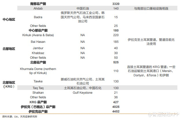 伊拉克大大小小油田加起来有80多座,其中探明储量在50亿桶以上的有8座。具体来看,南部有5座大油田,分别是Rumaila, West Qurna-1, West Qurna-2, Zubair 和 Majnoon,这5个大油田探明储量占到伊拉克总探明储量的一半,原油生产能力占到伊拉克总原油生产能力的60%以上。中部有一座,是Ahdab。东北部有两座,分别是Kirkuk和Bai Hasan。从行政划分上看,上述8油田所有权都来自伊拉克政府。库尔德斯坦地区政府(KPG)拥有 Khurmala Dome,Tawke,TaqTaq,Shaikan四个主要油田,但都是小油田,总的探明储量不到伊拉克全国探明储量的10%。