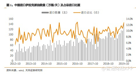 2019年以来,我国每月进口伊拉克石油平均在100万桶/天以上,占总进口比重也从2012年的6%左右提升至现在的10%以上,伊拉克已经成为我国石油进口第三来源国。