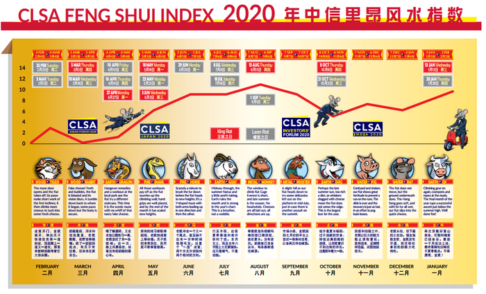第26个年头发布《中信里昂证券风水指数》的中信里昂证券表示,送走土猪,迎来金鼠。作为“一家之主、群雄之首”,富于生命力的老鼠携手值得信赖的鼠帮朋友登上舞台,迎接十二生肖新一个轮回的到来。去年的颤颤巍巍已经远去,空气中到处弥漫着祥和之气。