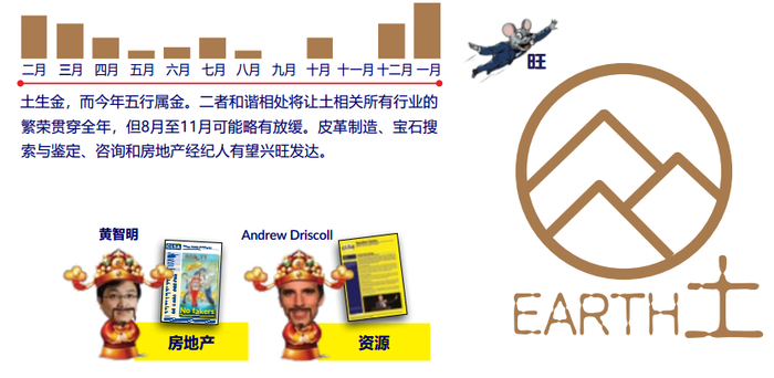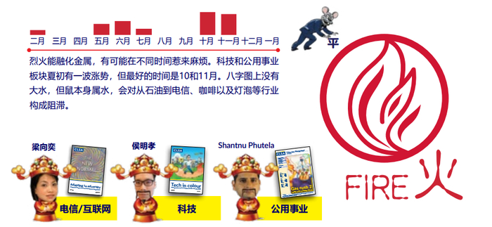 里昂预测,内需的医疗和消费板块在2月会有斩获。3月5日和4月27日是吉日,投资者可静待5至7月夏季的升势。房地产和资源这类与土相关的行业应该表现不错,房地产股全年利好,惟8月至11月可能略微放缓。10月和11月金元素势单力薄,火元素占优,金融和银行应当提高警惕。幸运的是,今年五形图上木属阳性,因此医疗卫生类股预料会有所斩获。我们预测火相关行业将在夏初迎来涨势,但科技和公用事业板块的最佳投资时间是10月和11月。