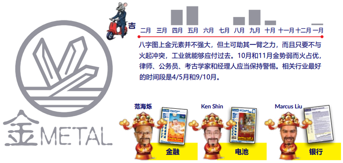 八字图上金元素并不强大,但土可助其一臂之力,而且只要不与火起冲突,工业就能够应付过去。10月和11月金势弱而火占优,律师、公务员、考古学家和经理人应当保持警惕。相关行业最好的时间段是4/5月和9/10月。