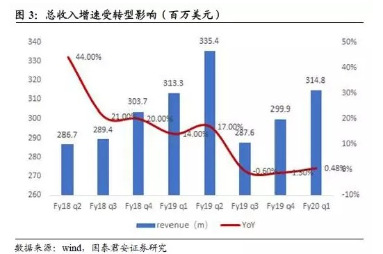 转型同时,毛利率不断提升。同时,毛利率不断提升,从FY2017的50%多的毛利率一直上升到FY2020Q1毛利率77%。