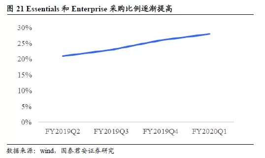 高研发投入保证产品线的进一步扩展。Essentials和Enterprise的系列产品组合的快速扩展,依靠高比例的研发投入作为保障,FY2019研发占比达到41%。