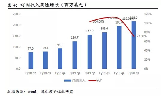 订阅收入增长极快。目前订阅收入增长很快,近一年来保持几乎同比翻倍增长。从最近的FY2020Q1来看,单季度的订阅收入达到2.18亿美元,增速为72%。