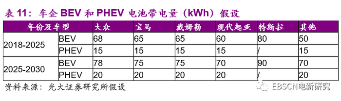 (1)根据车企计划推出的BEV/PHEV车型带电量,我们假设2020~2025年BEV平均带电量为75kWh,PHEV平均带电量为15kWh;2025~2030年BEV平均带电量85kWh,PHEV为20kWh;