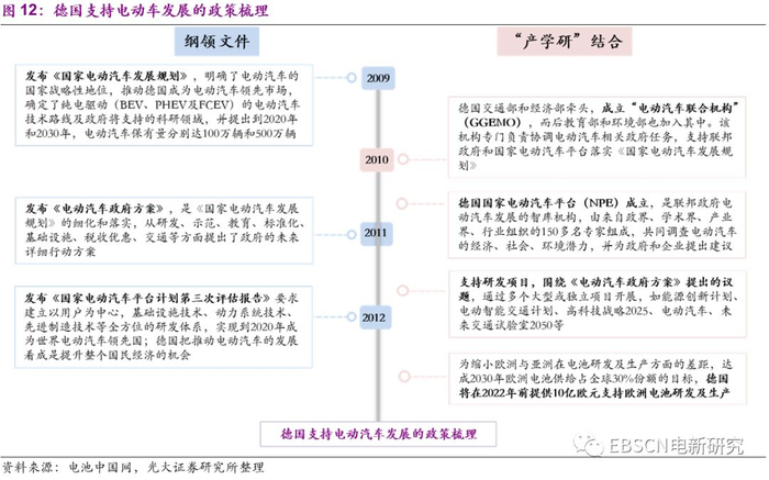 以德国为例,德国发展目标和政策明确,2009年以来发布了一系列纲领性文件,表示要将德国发展成为电动车的领先市场。另外,德国还注重发挥“政产学研”合力推进,并投入大量资金支持研发,以技术进步带动产业发展。德国政府牵头,先后成立了电动车联合机构(GGEMO)、国家电动车平台(NPE),支持研发项目,落实《电动车政府方案》提出的议题。