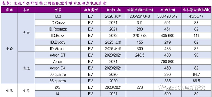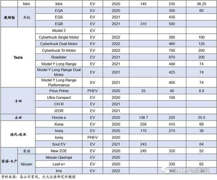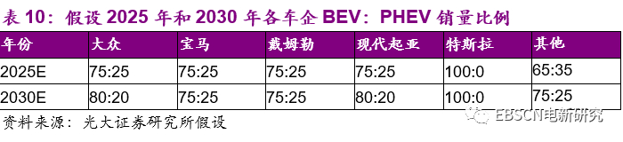 (3)我们假设2020-2030年BEV与PHEV的比例将从2019H1的70:30逐渐变为80:20,各车企具体比例假设如下;