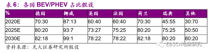 (2) 假设BEV在新能源汽车中占比不断提高,各国市场BEV/PHEV占比的不同。各国2020/2025/2030年BEV/PHEV占比假设如下: