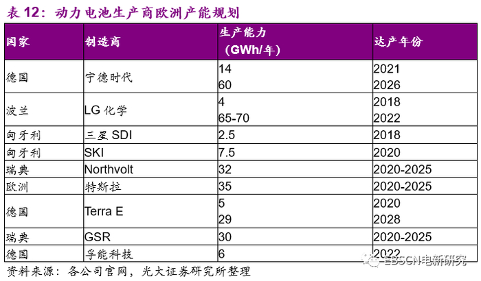 根据目前公布的产能规划,并考虑一些潜在的产能增量,我们预计欧洲到2022年产能将达到125GWh,2025年产能将达到250GWh。考虑到产能利用率一般在60%,2025年预计能利用的动力电池产量约150GWh,与前面动力电池需求的测算结果接近。