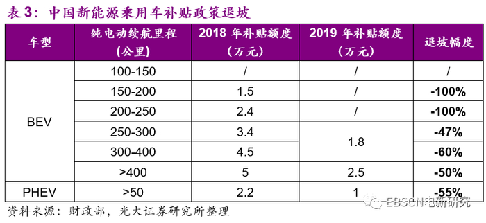 2019年3月中国更新了新能源车补贴政策,降低国补,取消地补,BEV退坡约47%-60%,PHEV退坡55%。中国政府期望通过这种方式促使企业进行技术升级,降本增效,促进行业优胜劣汰。