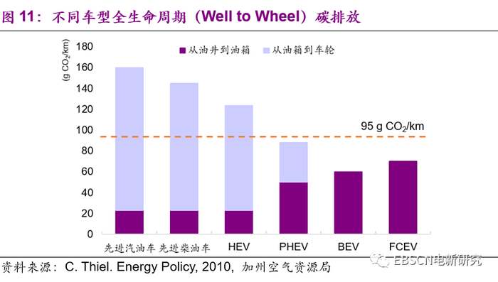 为了实现碳排放目标,发展PHEV和BEV是最佳解决方案。根据Energy Policy的论文指出,汽油车全生命周期的CO2排放量超过160 g/km,而柴油车为145 g/km,混动车的平均CO2排放量为124 g/km。