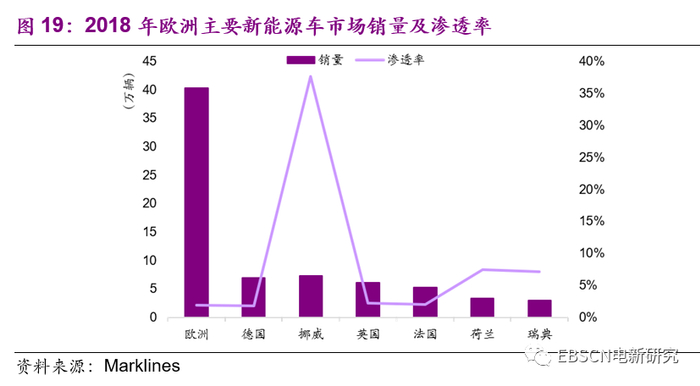 从渗透率来看,挪威电动化渗透率最高。挪威2019年Q1-3渗透率高达39.2%,荷兰和瑞典新能源车渗透率为10%左右。德国、英国和法国是欧洲汽车强国,渗透率却不足3%,德国渗透率仅为1.8%,未来渗透率有很大提升空间。