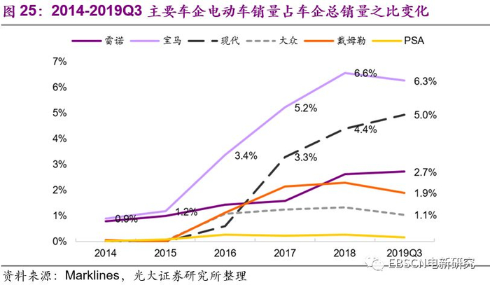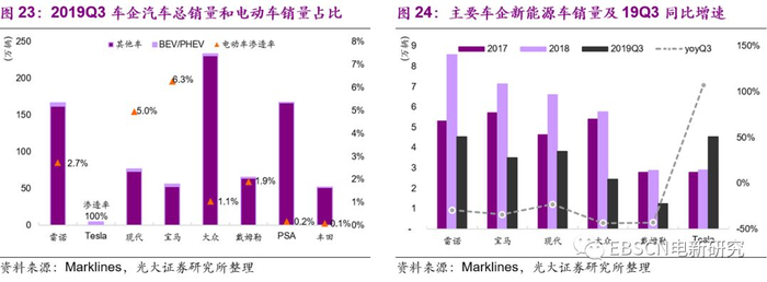 从电动车销量占车企总销量之比来看,2019Q1-3,除了特斯拉100%纯电动之外,其余车企的电动车销量占汽车总销量之比都低于10%,宝马6.3%,雷诺2.7%,戴姆勒1.9%,大众1.1%。