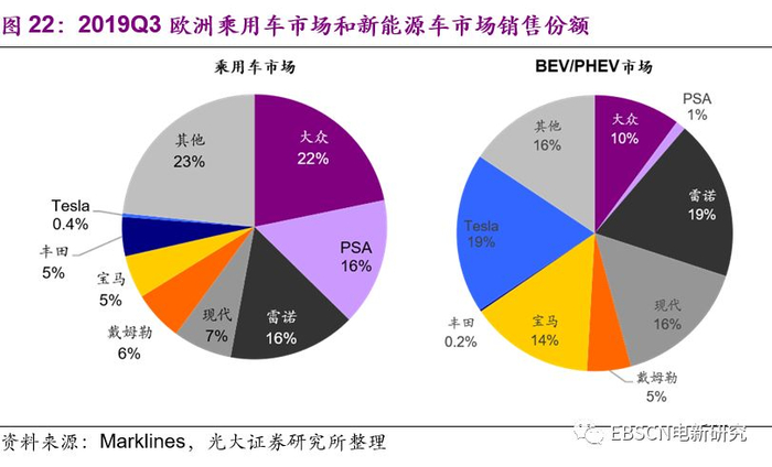 从新能源车市场份额来看,2019Q1-3雷诺-日产集团和特斯拉销量相当,占据约19%市场份额,大众、宝马、戴姆勒分别占据10%、14%、5%市场份额。