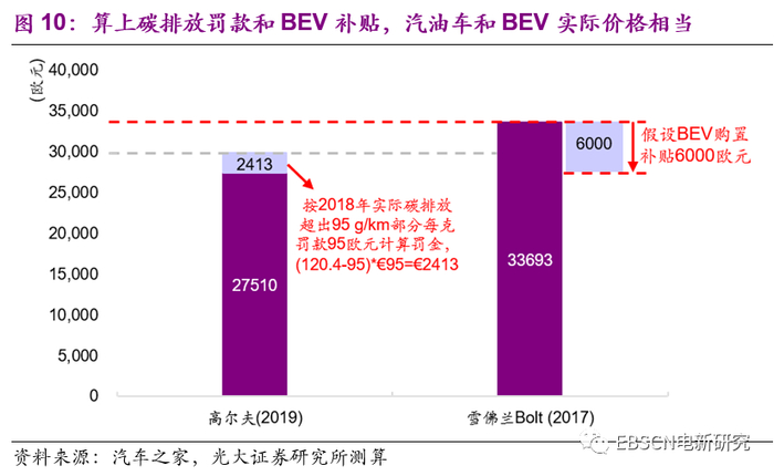 若考虑碳税罚款和电动车购置补贴,燃油车不再具备经济性优势。用可比较的汽车大众高尔夫和电动车雪佛兰Bolt测算消费者实际承担价格,汽车按2018年实际碳排放量超过95 g/km CO2的部分,每克95欧元计算罚金;电动车扣除政府购置补贴6000欧元(德国、法国、意大利等国的补贴政策),可以发现二者的实际价格相当。这里还没有把电动车的税收优惠算在其中。