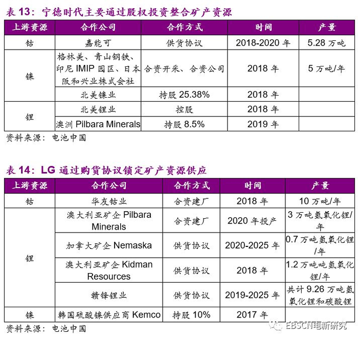 宁德时代对上游矿产资源有很强的把控能力,主要通过股权投资的方式把握资源和技术。宁德时代及其材料商赣锋锂业均是澳洲锂矿Pilbara Minerals的持股股东,通过持股可以获得更低价且稳定的锂矿供应。而LG化学则是通过合资建厂与签订供货协议的方式,提前锁定锂、镍等原材料供应,合作关系更为开放。