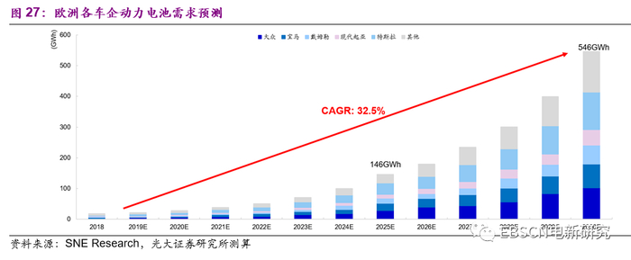 根据不同车企新能源汽车销量、BEV/PHEV占比、带电量加权得到各车企动力电池需求,再求和得到欧洲动力电池总需求。从车企电动化进程角度,我们预测2025年欧洲动力电池需求为146GWh,2030年将增加到546GWh,复合增速32.5%。
