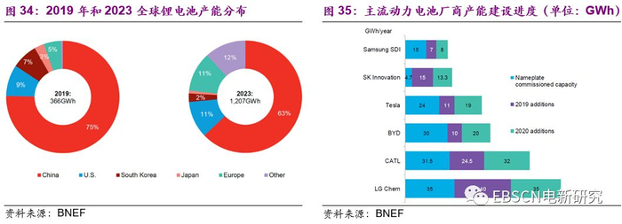 2019年动力电池装机量约62.4GWh,同比增长9%。2019年12月,工信部发布《新能源汽车产业发展规划(2021-2035年)》(征求意见稿),目标到2025年新能源汽车新车销量占比达到25%左右,中国的电池产能仍会有较大增长,预计未来会占到全球一半的产能。另外值得注意的是,由于欧洲的碳排放政策收紧和车企电动化序幕的开启,欧洲的电池产能将会在2020年后有较为显著的提升。