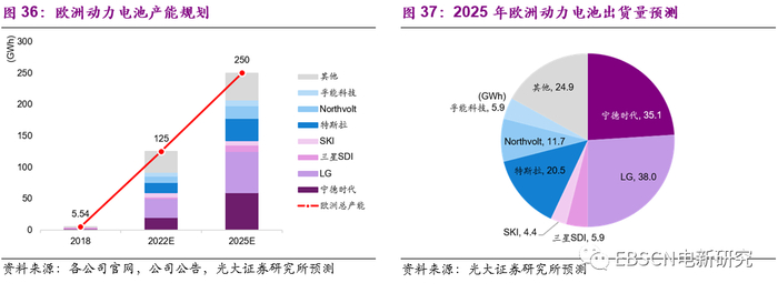我们根据前文预测的2025年欧洲动力电池需求平均值145GWh,按照各电池厂产能规划比例,相乘得出2025年各电池厂欧洲动力电池出货量预测。