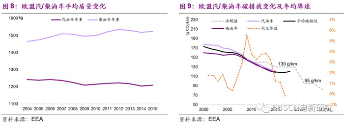 为了落实碳排放目标,欧盟在2009年颁布了首个针对新登记乘用车二氧化碳排放的强制性标准EU 443/2009,要求到2015年乘用车碳排放应降低至130g/kmCO2以下。导入强制法规之后,各汽车厂商的应对措施迅速落地,通过改善内燃机效率,并且通过尾气处理装置,同时开发轻质化和降低行驶阻力等新技术,可以满足当时的减排目标。临近2015年所有企业的油耗都明显下降,2015年实际排放量为119.5g/km CO2,满足了当年的碳排放法规。