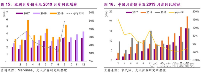 欧洲有望接棒中国,成为下一个增速较大市场。从每月的数据来看,欧洲近三年的月度销量同比都有稳定增长。受补贴影响,2019年Q1-3的月度同比增速都保持在30%左右,增长势头良好。而最大的中国市场由于受到补贴退坡的影响,在2019年下半年出现了同比下滑。