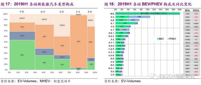 2019H1,欧洲新能源车销量的68%为BEV,而2018H1为51%。在欧洲PHEV首次出现销量下降,这是由于BEV相对于PHEV有着更低的碳排放,更能帮助车企满足严苛的排放政策。从各国的情况来看,2019H1相比2018H1,BEV份额呈增长趋势。