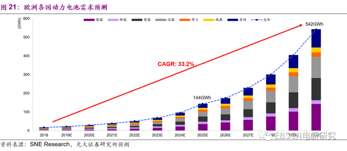将预测得到的新能源汽车销量与相应带电量相乘累加,我们得到了未来10年欧洲动力电池的需求预测。从欧洲各国低碳政策角度出发,我们预测2025年欧洲动力电池需求约为144GWh,2030年将达到542GWh,复合增长率33.2%。
