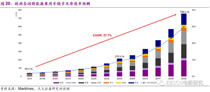 我们根据假设得到的渗透率和未来各国的乘用车总销量,得到了欧洲各国未来10年的新能源乘用车销量情况预测。根据预测,欧洲新能源乘用车销量在2025年将达到215万辆,2030年达到756万辆,复合增长率27.7%,届时,新能源汽车渗透率将达30%。