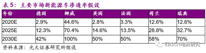 (4)我们根据欧盟主要国家提出的电动化目标以及各国减排的决心,假设了2030年和2050年其新能源汽车的渗透率。并假设其间每年的渗透率匀速增长。