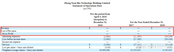 翻开中元生物招股书,该公司的净收入、销售成本以及毛利润项目上均显示“0”,意味着这家公司本体并未产生任何收入。即便如此,在2016-2018年,这家公司的营业费用还是在持续上涨从2062美元大幅增至50156美元,并且营业费用即是导致其净亏损的主要原因。