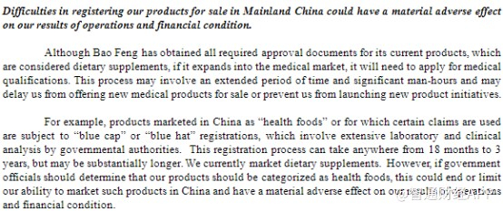 在招股书的风险因素中,公司提到“在中国销售的“保健食品”产品必须经过“蓝帽子”注册,此注册过程可能需要18个月到3年的时间。但如果政府官员认定我们目前销售的膳食补充剂产品应归类为保健食品,则可能会终止或限制我们在中国销售此类产品的能力,并对我们的经营业绩和财务状况造成重大不利影响”。